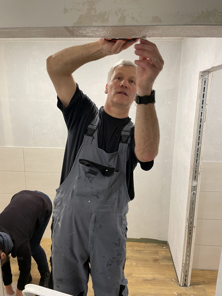 Und weiter ging es am 07.02.26. Nachdem der Putz trocken war konnten die weiteren Arbeiten fortgeführt werden. Für die Deckenlampen wurden die Aussparungen in die Decke platziert. Die Steckdosen wurden installiert und neue Außenleuchten angebracht. Im Lager wurde die Wand haftbar gemacht so dass der Filzputz später aufgebracht werden kann.